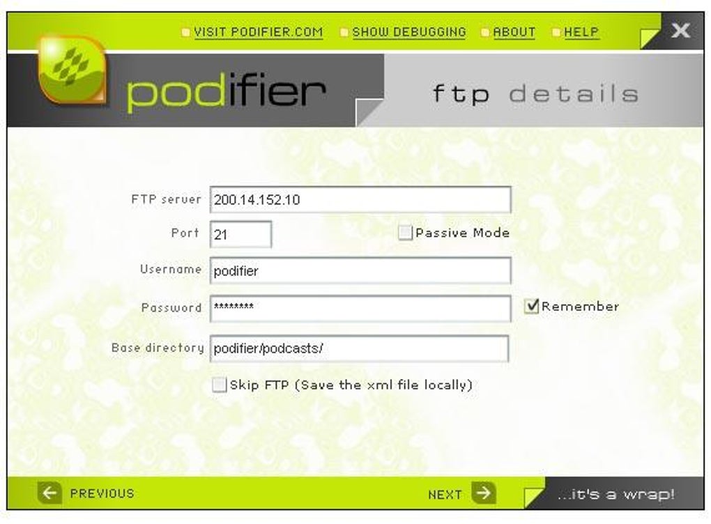 Podifier facilita el proceso de creación XML al reducirlo a unas cuantas etapas en las que irás rellenando los campos de texto disponibles: título y descripción del podcast, ubicación del archivo MP3 y datos del servidor FTP. Si ya tienes el fichero MP3 preparado, podrás publicarlo en tu página web en un santiamén.